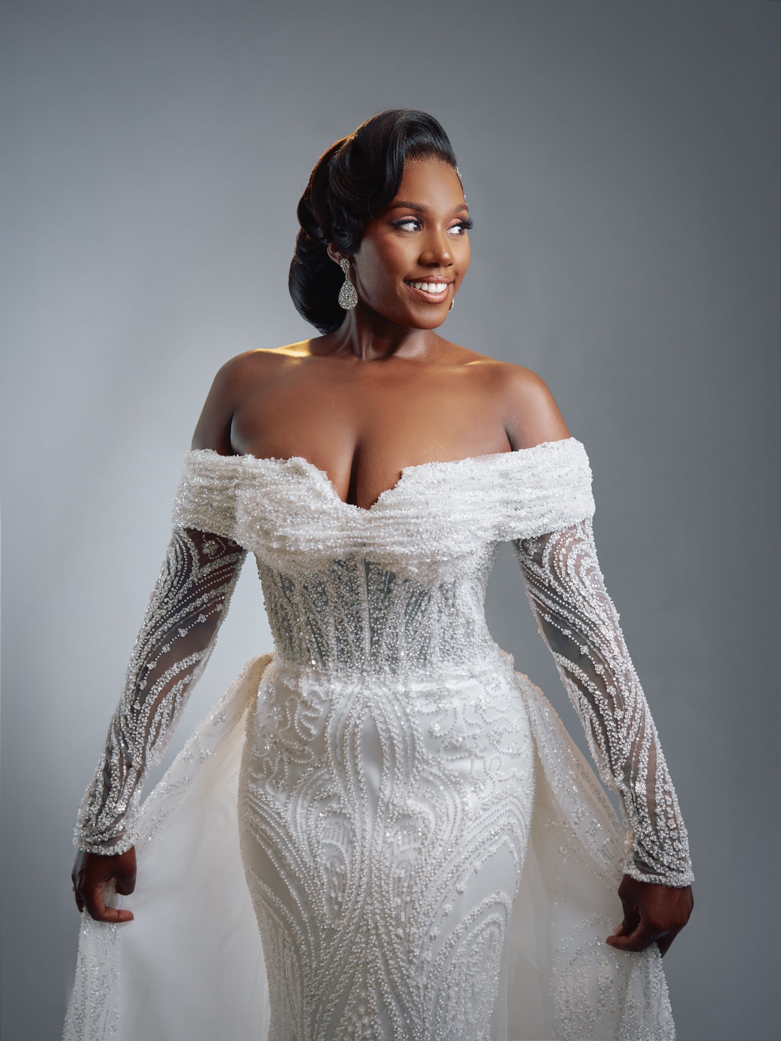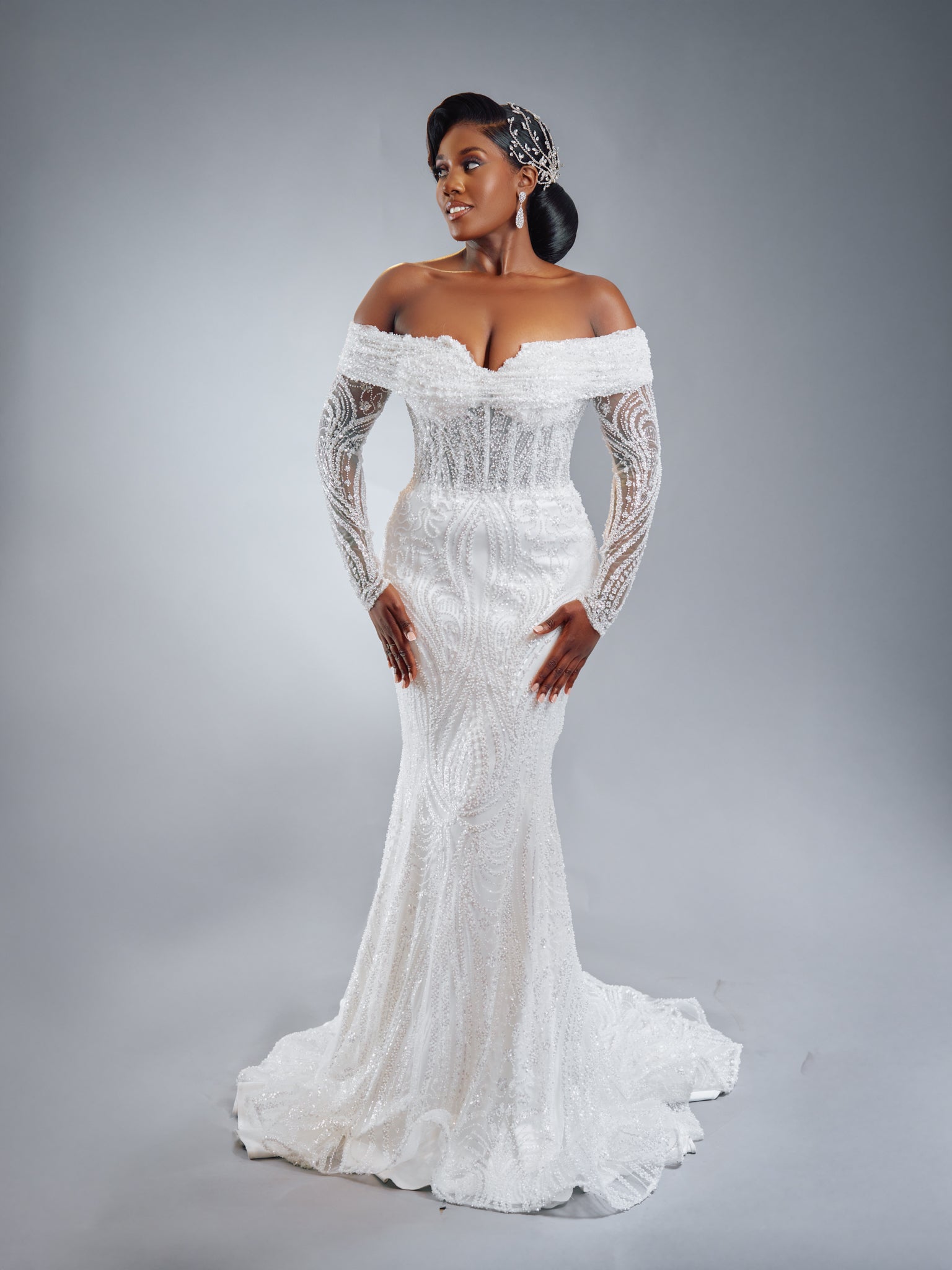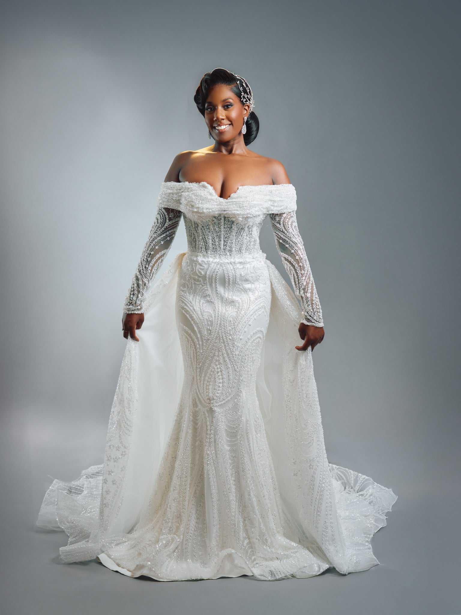 The La Sirena 014 is a masterpiece of modern couture, crafted for brides who desire both timeless elegance and contemporary versatility. This off-the-shoulder mermaid gown is adorned with intricate beadwork, sheer embellished sleeves, and a structured corset bodice that sculpts the figure to perfection.