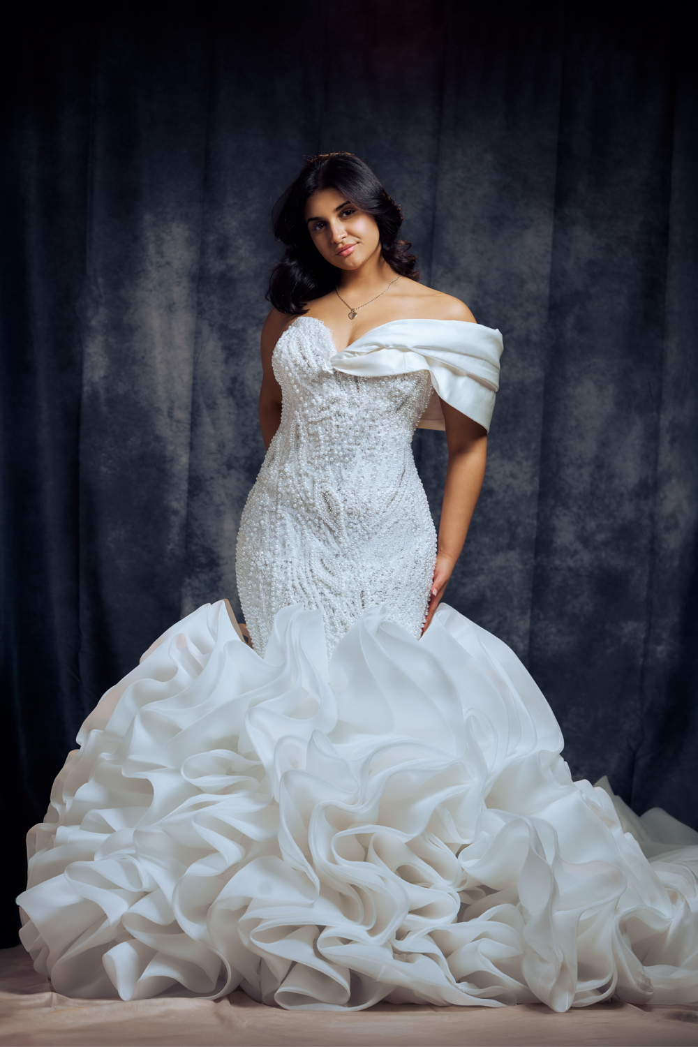 The dramatic ruffled skirt, a cascading masterpiece of layered tulle, flows seamlessly from the fitted structure, adding volume and movement to every step. Customizable in length, this ethereal train allows brides to personalize their look for a truly grand entrance.